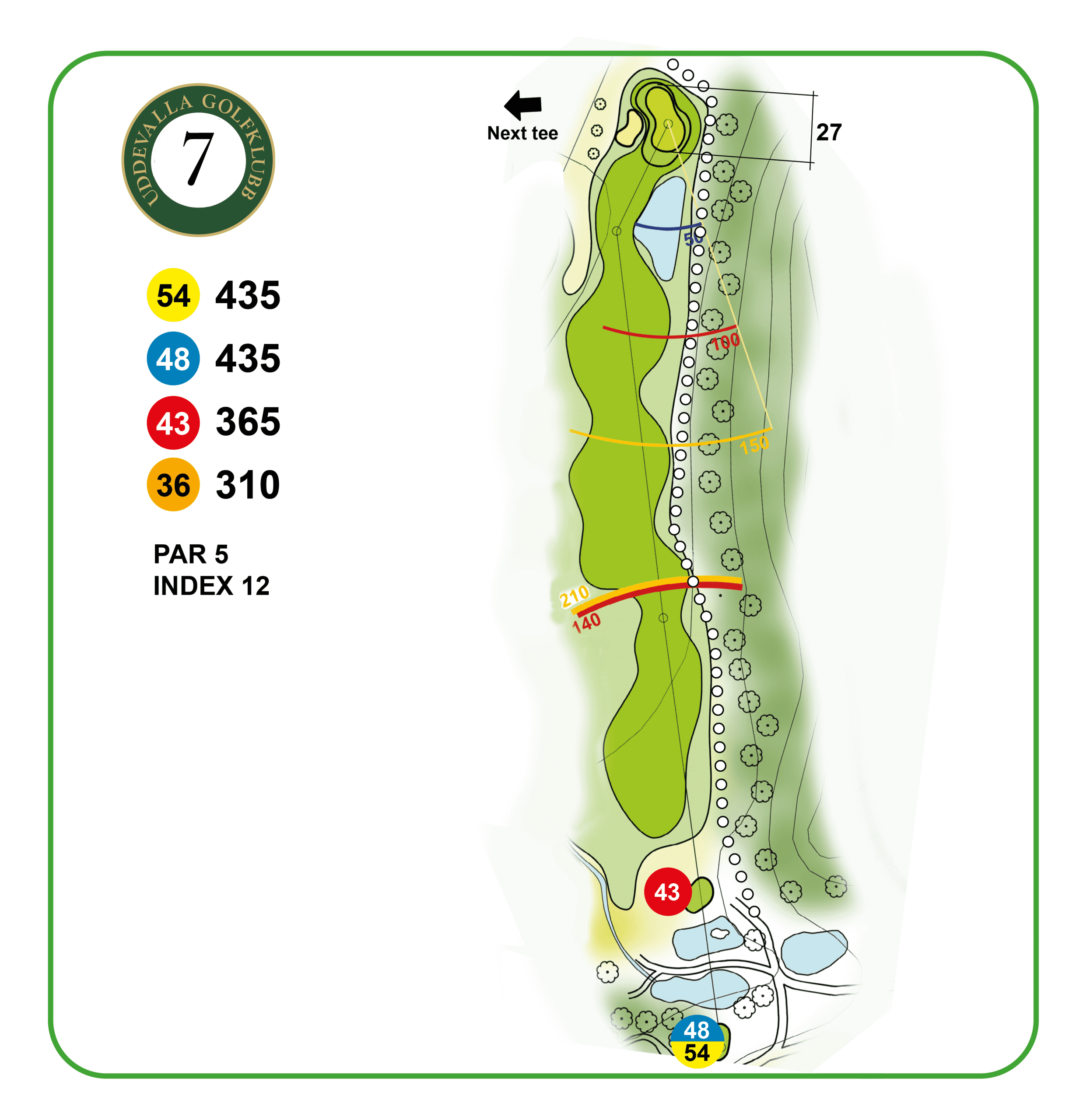 7. Ropa fore vid slag långt åt vänster. Dammen till höger är närmare än man tror vid andraslaget. Spela antingen kort om dammen eller sikta till vänster om den.