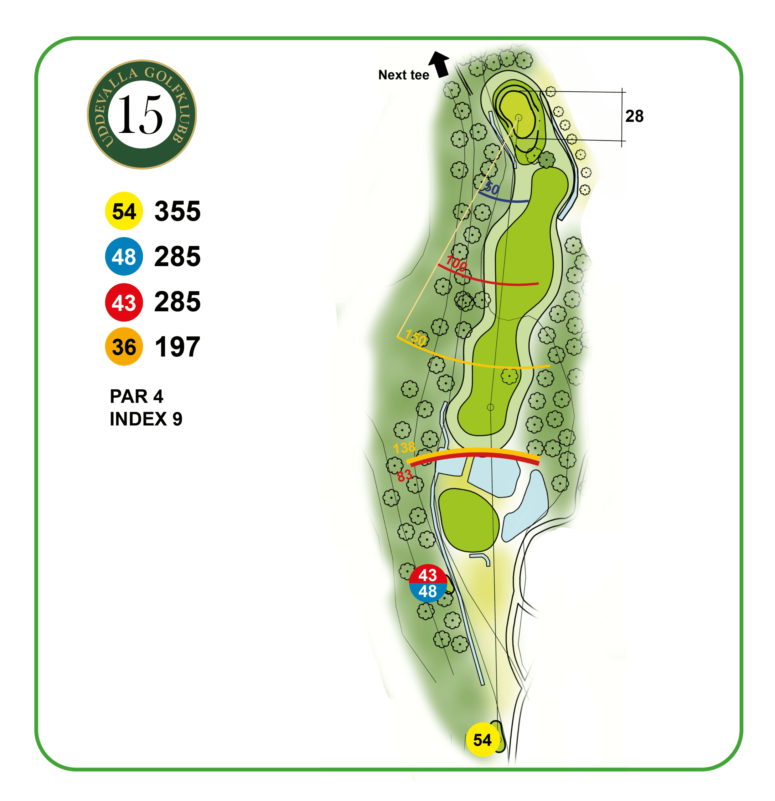 15. Ganska svår par fyra trots relativt högt index. Antingen slår du fram dig kort före dammen med ett järn eller så drivar du rakt. Smalt landningsområde så raka slag är att föredra. Ofta motvind på det här hålet som givetvis påverkar om bollen hamnar i dammen eller flyger över.